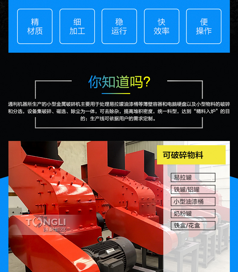 河南通利7080破碎机由主机一台,生产线一条,磁设备一台,输送机一台,电机一台组成,厂家可为您提供系列化的金属破碎机和整个破碎工厂的工艺装配配置。用于破碎轻薄料如汽车外壳混合废金属,包括金属打包块的破碎,机器通过不断、化以及经验的积累,掌握了设计和制造金属破碎机的技术诀窍,从而设备长期可靠地低成本运行。