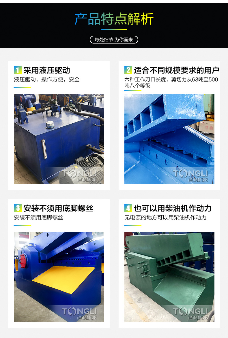 A:适用于金属回收加工厂、报废汽车拆解场、冶炼铸造行业,对各种形状的型钢及各种金属材料进行冷态剪断、切断处理。