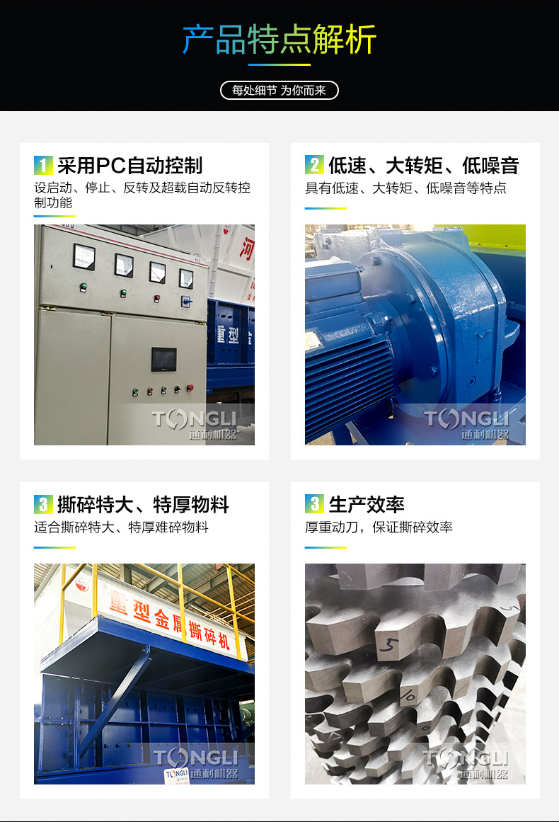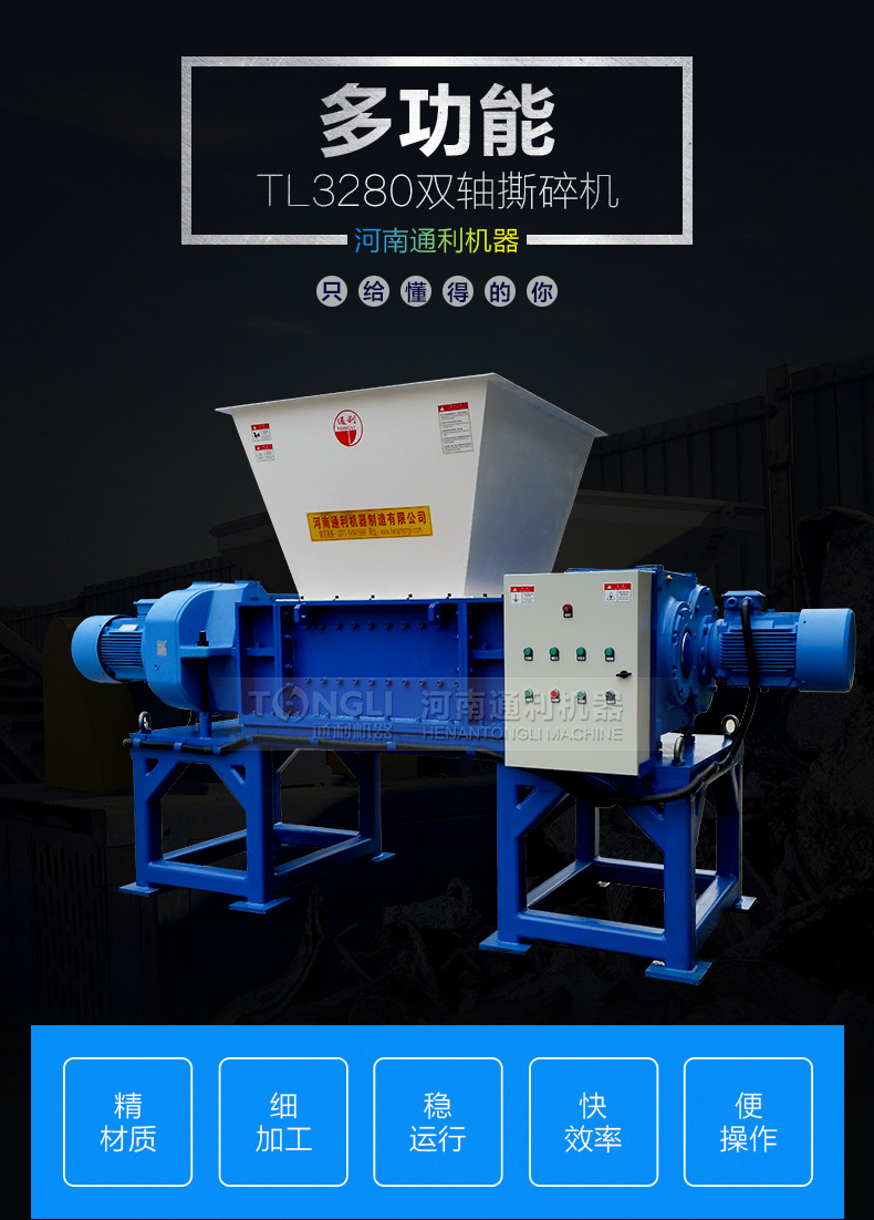 双轴撕碎机又名剪切式撕碎机,通过剪切、撕裂和挤压达到减小物料尺寸、刀具的厚度和刀爪数量可根据不同物料换。撕碎中空物料时可配备压料装置提产量。另可添加旋转筛网控制出料尺寸。低转速运行,噪音和粉尘可达到较的标准。通利撕碎机经过多年研究与实践,并根据实际情况进行改进,推出技术成熟和设计的金属撕碎机系列,为的废物回收利用前期的破碎,减容处理提供质量可靠的设备。