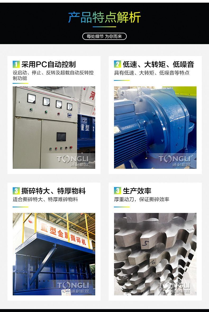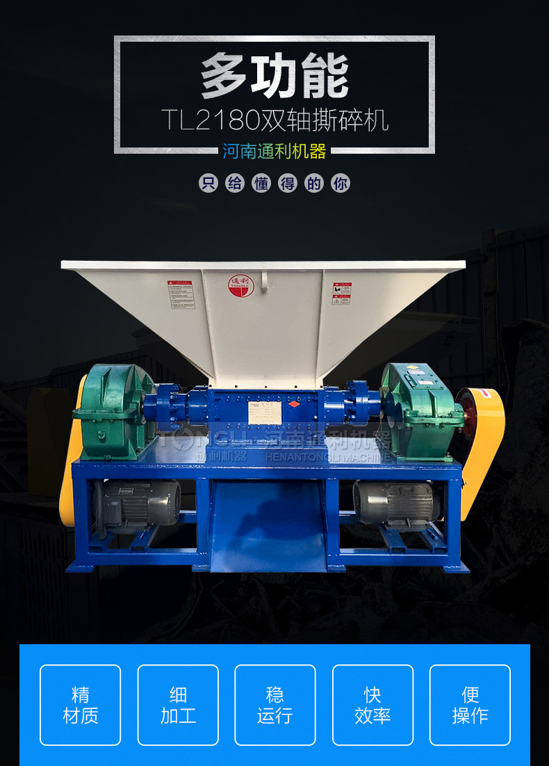 双轴撕碎机又名剪切式撕碎机,通过剪切、撕裂和挤压达到减小物料尺寸、刀具的厚度和刀爪数量可根据不同物料换。撕碎中空物料时可配备压料装置提产量。另可添加旋转筛网控制出料尺寸。低转速运行,噪音和粉尘可达到较的标准。通利撕碎机经过多年研究与实践,并根据实际情况进行改进,推出技术成熟和设计的金属撕碎机系列,为的废物回收利用前期的破碎,减容处理提供质量可靠的设备。